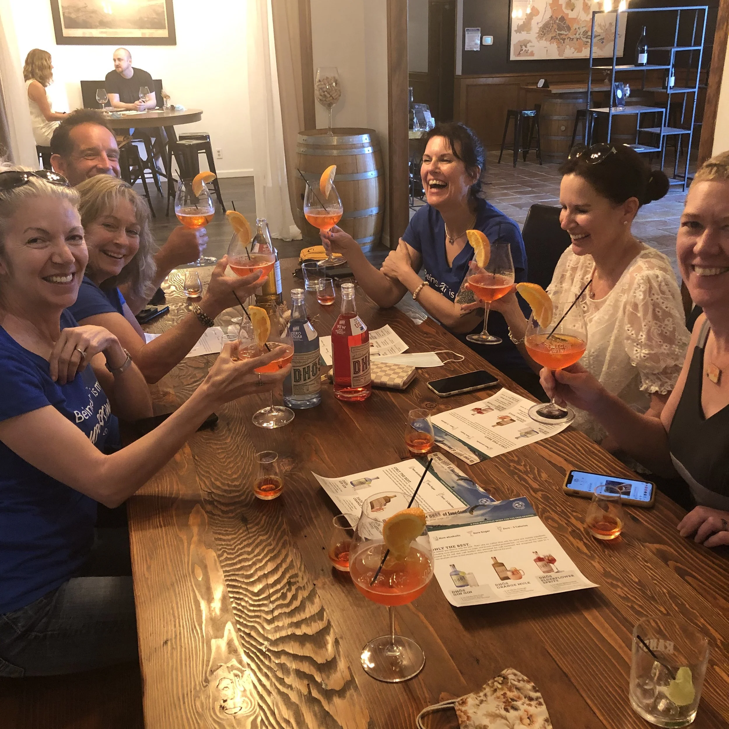 We were the table whooping it up and getting loud, when I escorted a group of sober rebels from the This Naked Mind community around Oregon’s Wine Country, including the tasting room in Dundee where we sampled AF spirits and cocktails by Dhos.